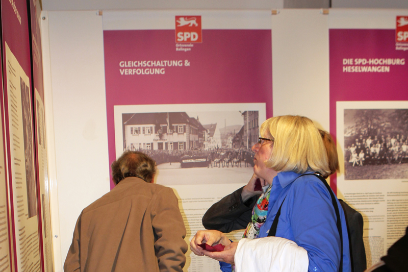 Viele Stunden verbrachten die Genossinnen und Genossen zur Vorbereitung der Ausstellung in den Stadtarchiven in Balingen und Albstadt und auch aus privaten Beständen wurde Material gesichtet und zusammengetragen. Mithilfe modernster Technik entstanden professionelle Informations-Fahnen in einem ansprechenden Layout. Aber auch originale Schriftstücke aus längst vergessenen Zeiten wurden in Glasvitrinen ausgestellt und weitere Ausstellungsgegenstände in Schaukästen ausgestellt. Während der Ortsverein Balinger den Schwerpunkt seines Ausstellungsbeitrags auf die Zeit der Weimarer Republik und Hitlers Machtergreifung konzentrierte, stellten die Genossinnen und Genossen aus Albstadt einen Verlauf ihrer Parteigeschichte bis in die heutige Gegenwart dar.